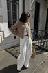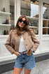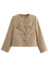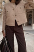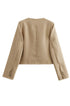 Dokulu tüvitten yapılmış bu zarif bej ceket, klasik zarafeti modern, kısaltılmış bir siluetle birleştiriyor ve parlak bir sonbahar görünümü için mükemmel. İkonik düğmeli tasarımıyla sofistike, üst düzey bir estetik yayar ve bu da onu ofis veya şık gündelik ortamlar için ideal kılar.