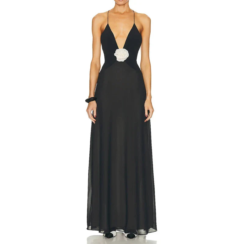 Göğüs Gül Detaylı Sırt Dekolteli Maxi Elbise