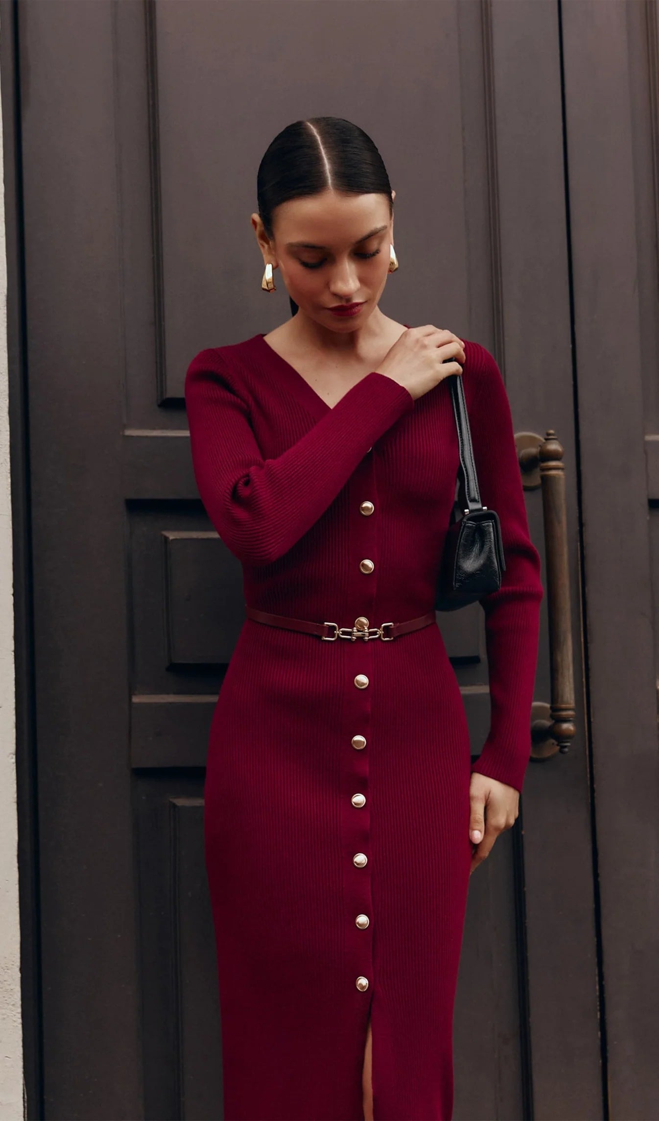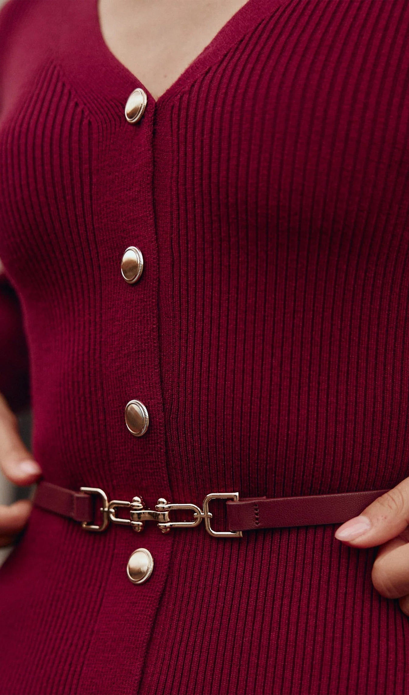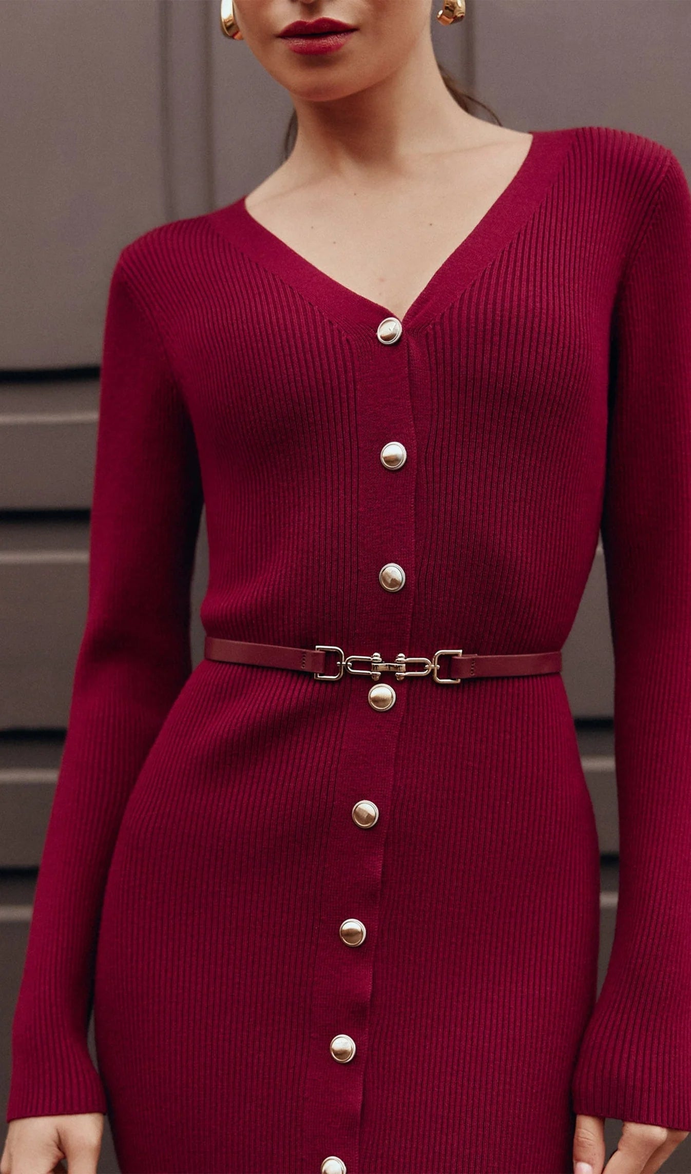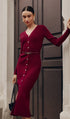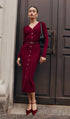V Yaka Kemerli Örme Midi Elbise